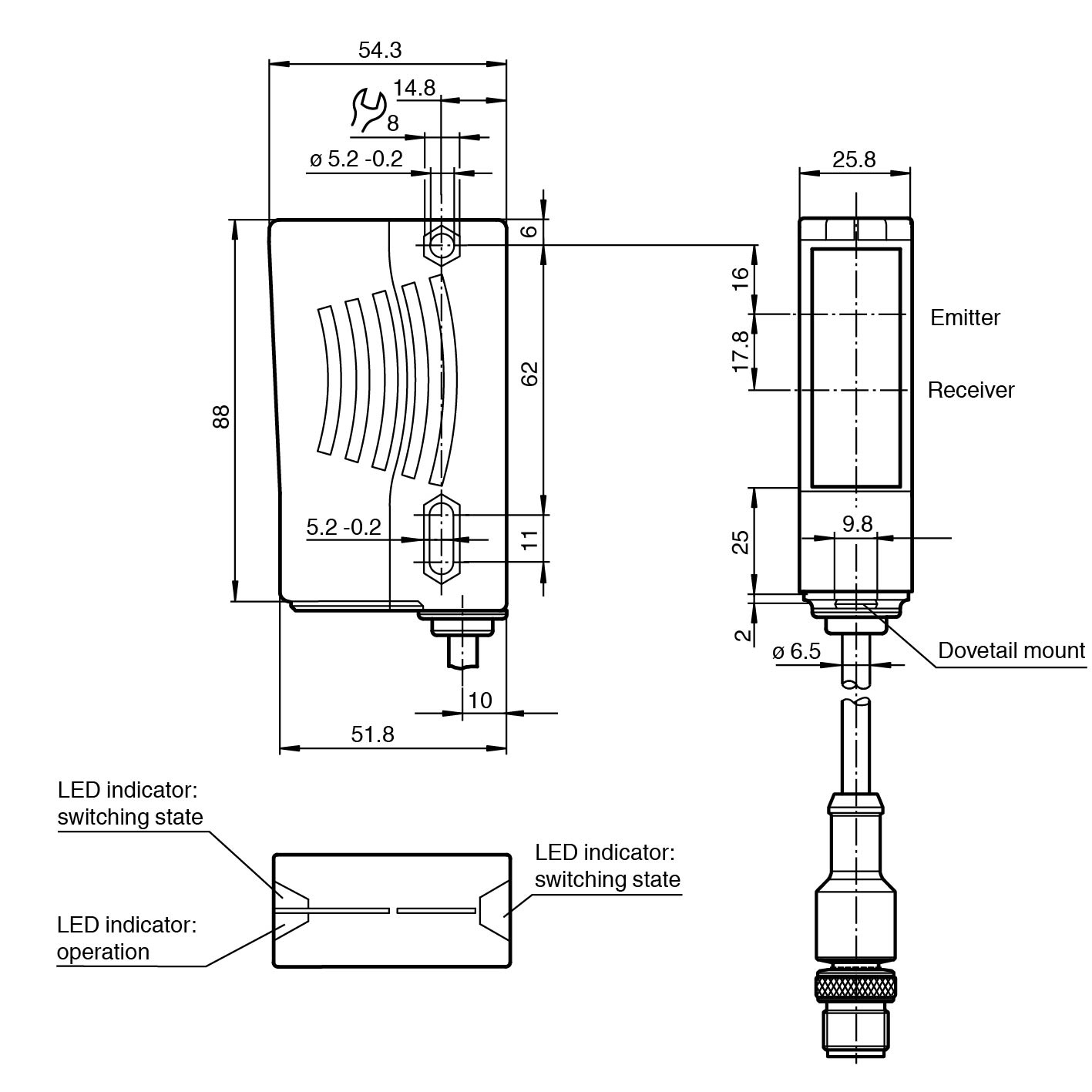 Clearly visible LEDs for Power ON, switching state and weak signal indication